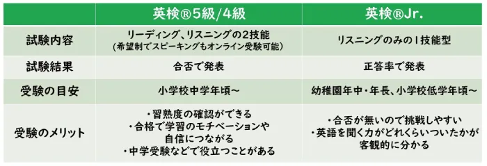 英検®と英検Jr.®の2種類の試験について、受検の目安やメリットなどの主な違いをまとめました。