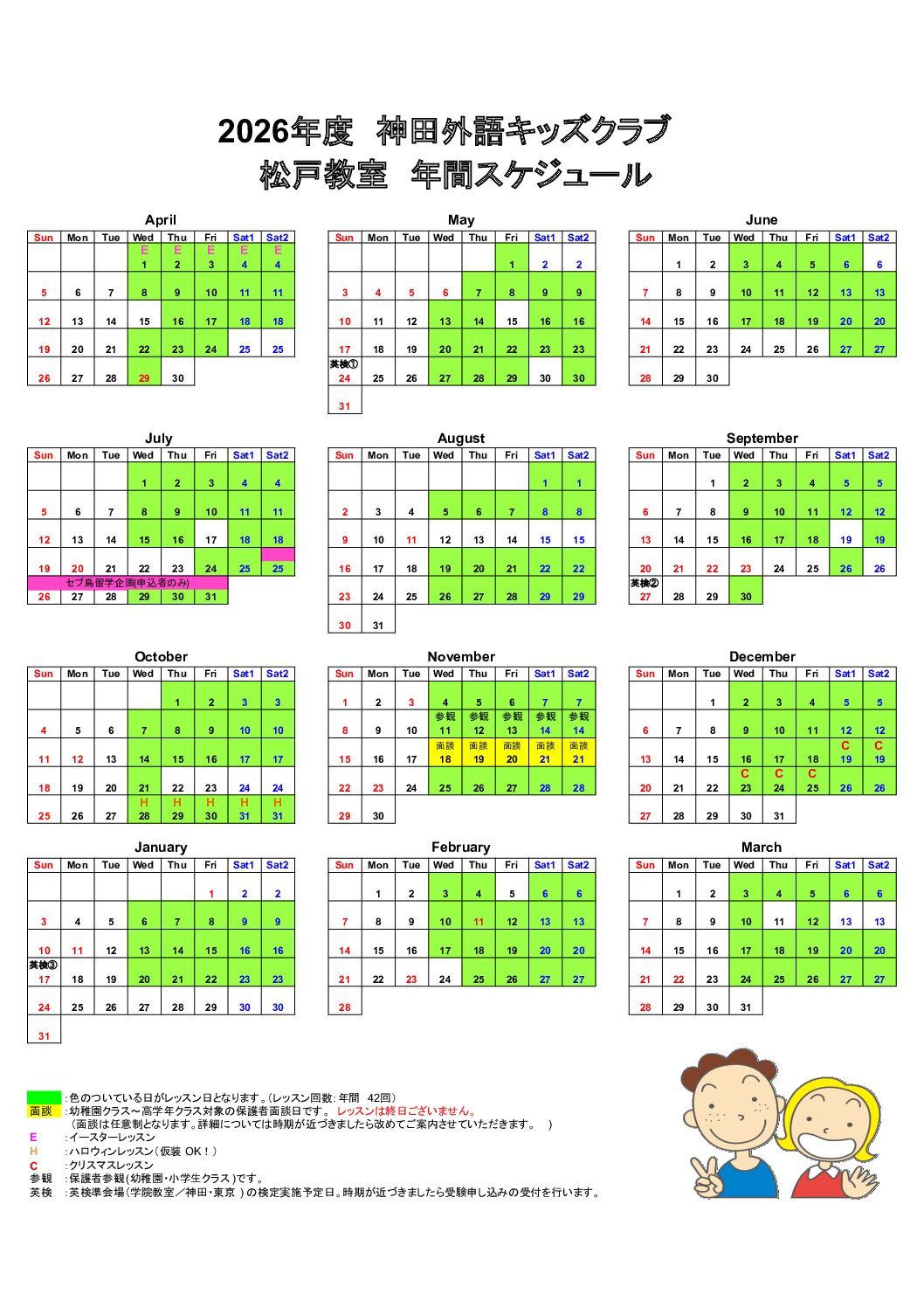 神田外語キッズクラブ松戸教室(イトーヨーカドー松戸3階)の2026年度レッスンスケジュールです。