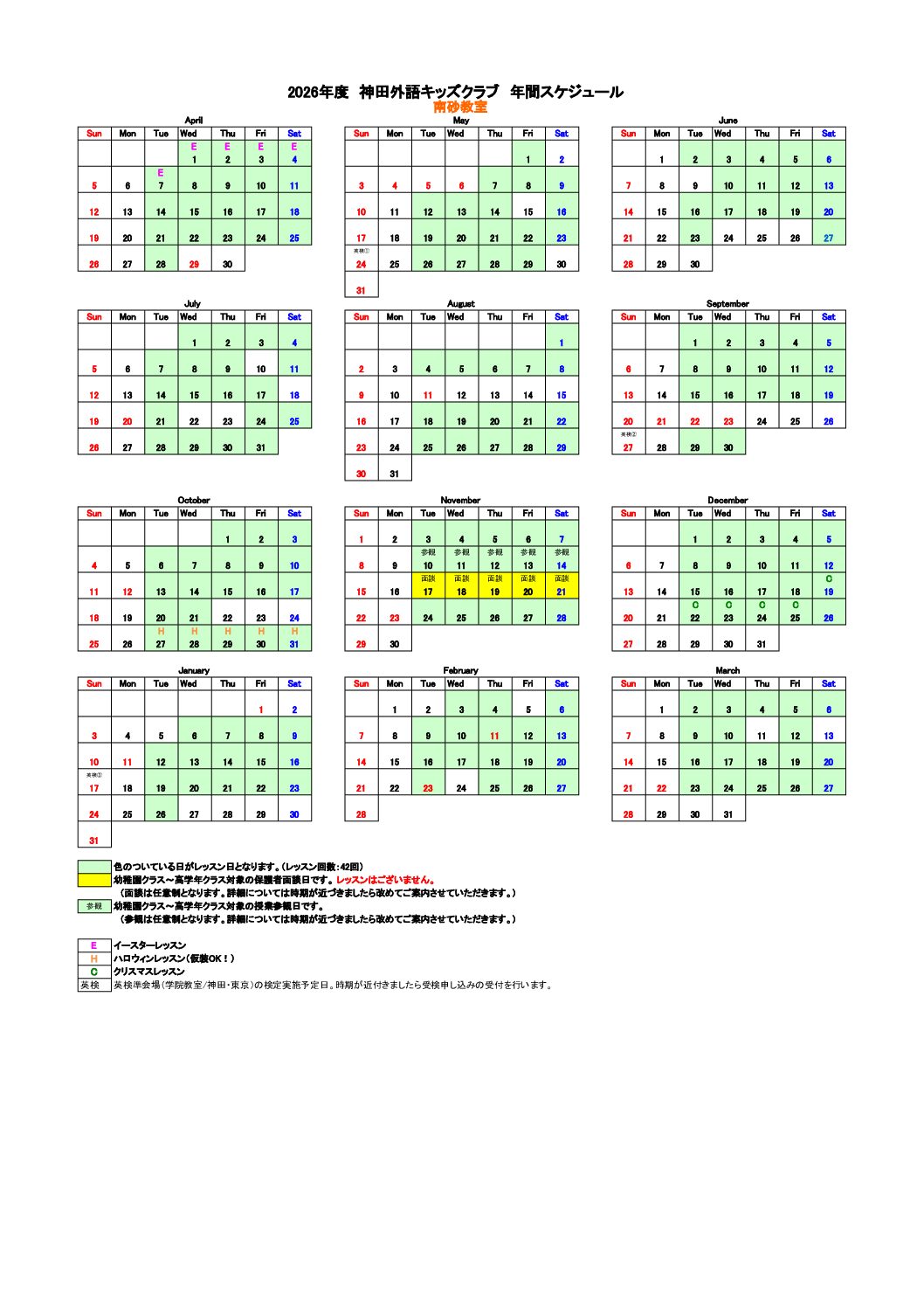 【南砂教室】2026年度 年間レッスンスケジュール